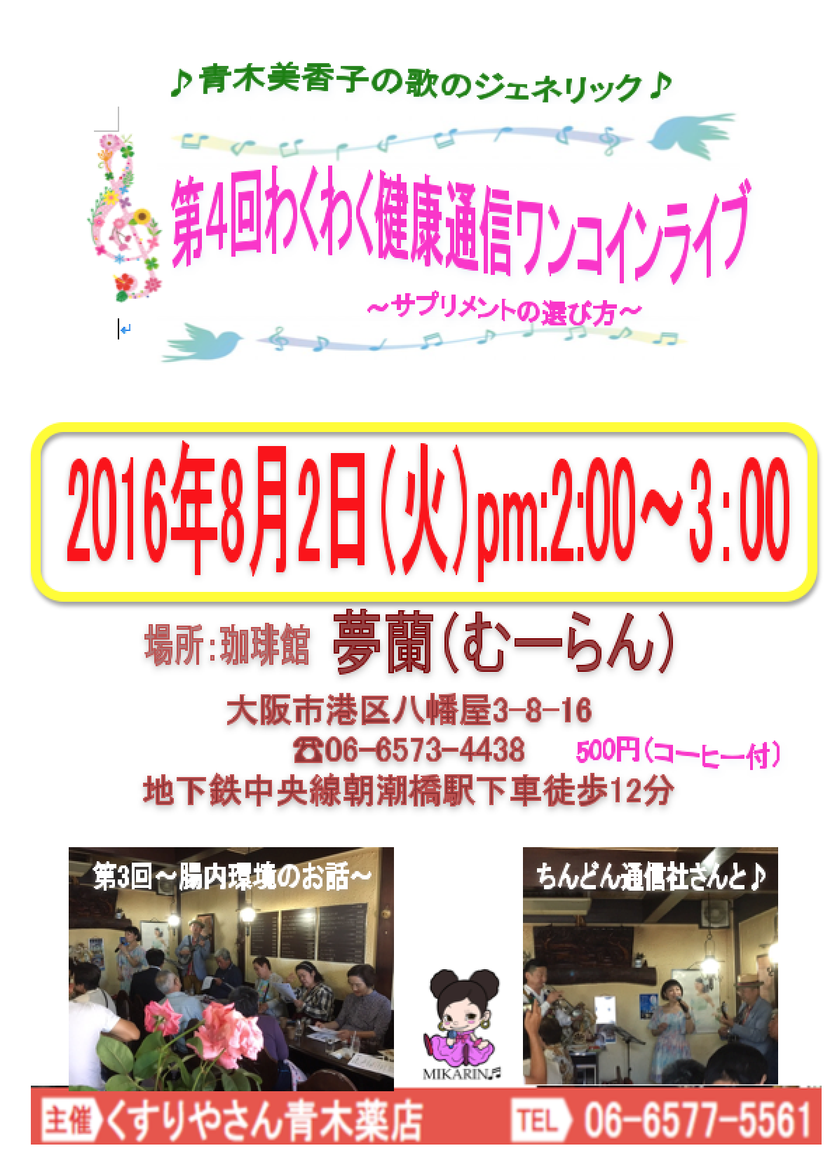 ♪青木美香子の歌のジェネリック♪ 第4回わくわく健康通信ワンコインライブ テーマは「サプリメントの選び方」。目からウロコの内容も飛び出しすぐに役立つ情報満載!!ライブコーナーは、青木美香子の歌あり林幸治郎の「お笑いちんどん道場」ありでお楽しみ頂ける内容です✌️健康と音楽に興味のある方、是非ともご来場をお待ち申し上げます❤️